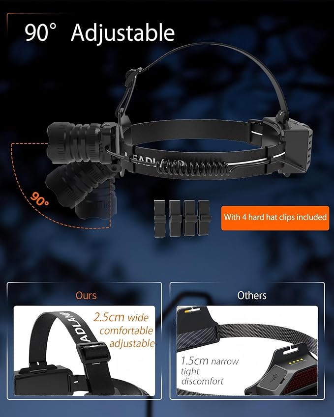- 【4000Lumens Super Bright LED Headlamp】Our Rechargeable Headlamp strongest brightness is 4000 lumens. Equipped with P50 high brightness LED beads that can provide focused, brighter, farther and more stable illumination without shadow. With stepless zoom function, the lamp head can be telescoped to change the focal length.