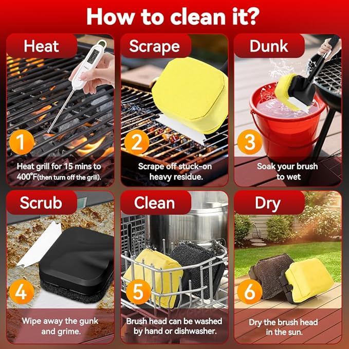 - REPLACEABLE CLEANING HEADS: Includes 2 replaceable cleaning heads, the brushes are held in place by strong snaps that won't come off while cleaning. The replaceable cleaning heads are designed to extend the life of your grill brushes while saving you more money.