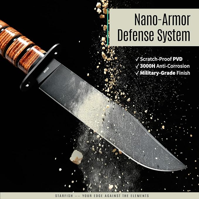 STARFISH Fixed Blade Knife, 7.0” DC53 Steel Blade with Black Titanium Coating Full Tang Hunting Knife with Sheath, Ergonomic Leather Handle Bushcraft Bowie Knives for Camping, Hiking