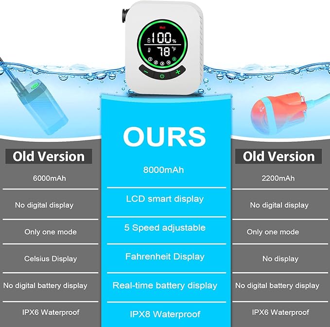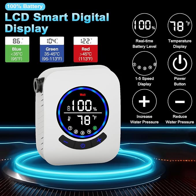 - 【Advanced Smart LED Display】 Our portable camping shower features an upgraded LED display that allows you to clearly monitor the battery level and water temperature in real time. From 50–122°F, you’ll be sure to avoid heat burns and power outages while enjoying your outdoor adventure. Whether you're hiking or relaxing at the beach, this portable shower delivers the latest information with smart technology to enhance your camping experience.