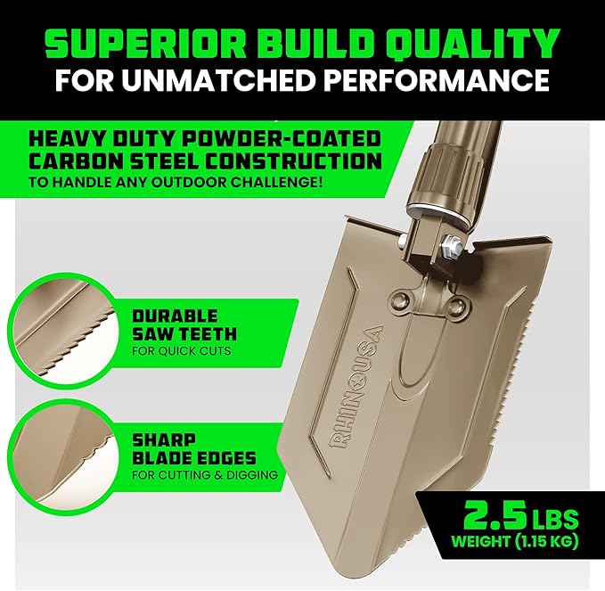 RHINO USA Folding Survival Shovel w/Pick - Heavy Duty Carbon Steel Military Style Entrenching Tool for Off Road, Camping, Gardening, Beach, Digging Dirt, Sand, Mud & Snow - Tan