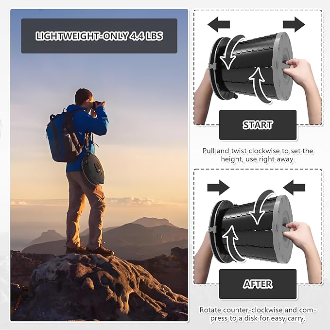 - One-second folding is extremely portable: simply rotate clockwise to lift, rotate counterclockwise to press and instantly fold into a disc just 3.3 inches thick, about the size of a frisbee, and weighing just 4.4 pounds. Equipped with waterproof carry-on bag, easy to put into the backpack, suitcase or car trunk small space, travel without burden.