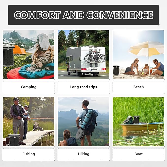 - Multi-functional integration: a multi-purpose, greatly saving travel equipment space and weight. Open the lid as an emergency toilet or trash can; close the lid as a folding stool or firm side table; or as a storage bin. Ideal for camping, hiking, RV travel, fishing, sailing, long-distance driving and family emergencies.