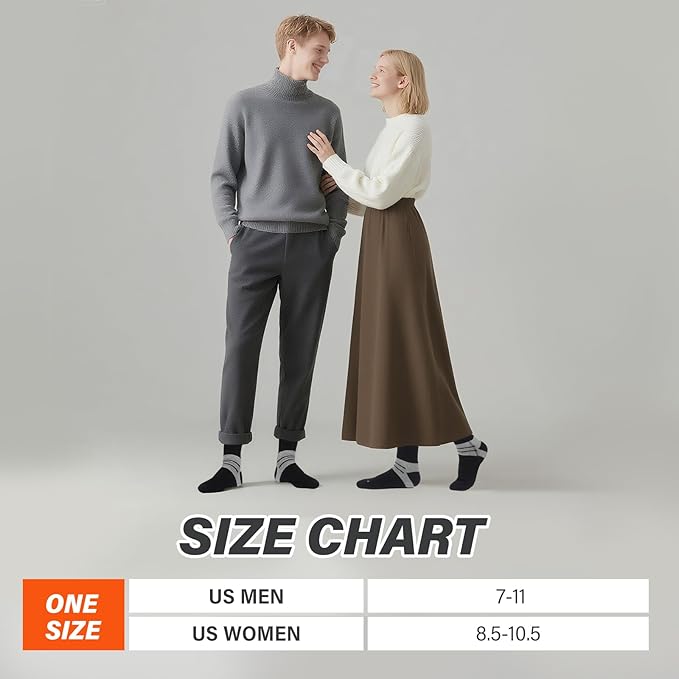 - Premium Fabric: These electric heated socks are made from a polyester-blend fiber. They offer very soft touch, excellent breathability, and great elasticity—ensuring long-lasting comfort and a snug fit even after long-time wear. The one-size fits most design accommodates a wide range of foot sizes: US Men's sizes 7–11 and US Women's sizes 8.5-10.5.