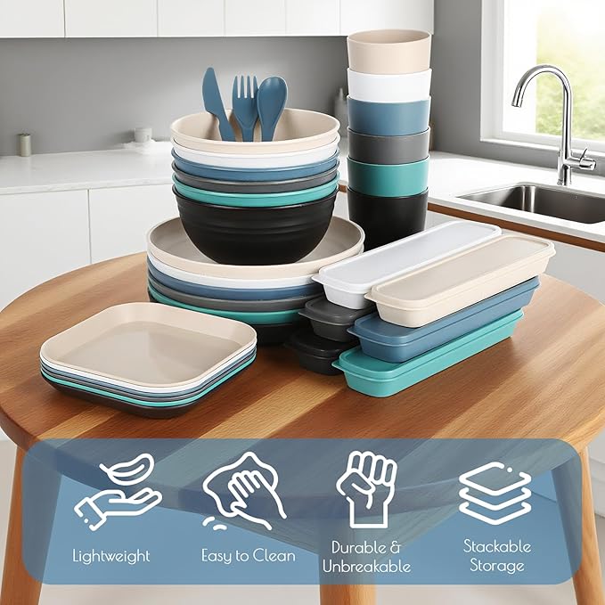- Easy to Clean & Space-Saving - The smooth surface made our dorm dishes set easy to clean with our matching cleaning sponge. Our dorm dish set are not easy to leave the stain on the surface and can easy to washed. Besides, all of our plastic plates and bowls sets are stackable, which is they won't occupy your space