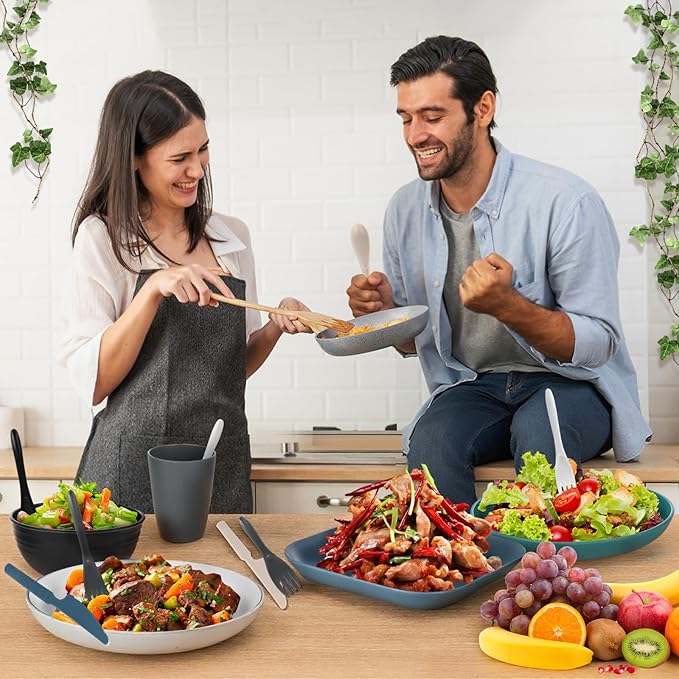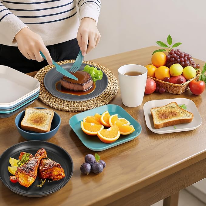 - Lightweight & Unbreakable Plates Set - Our plastic plates reusable are made of premium wheat straw and reliable plastic, which is harmless and eco-friendly. The dinnerware set is drop resistance and bump resistance due to the characteristics of the material. Besides, they are also lightweight and portable enough for you to take outside