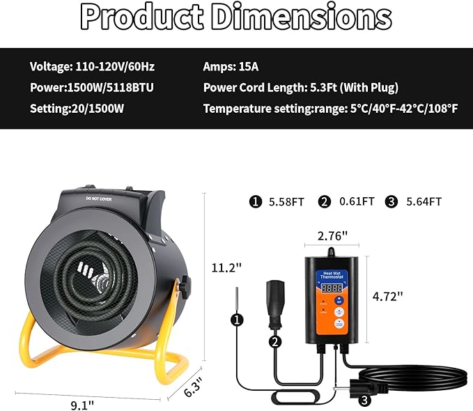 - Greenhouse Heater with Digital Thermostat: Maintains temperatures between 40℉-108℉ (5℃-42℃) through automatic cycling, protecting plants from temperature fluctuations across seasons.