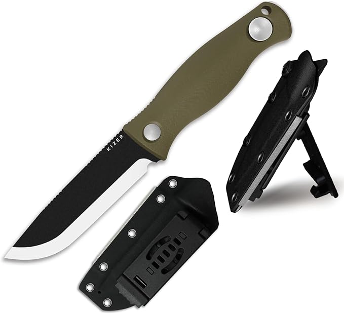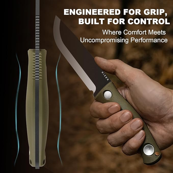 - Engineered for Grip, Built for Control: The Kizer Polaris fixed blade hunting knife features an ergonomic, spindle-shaped green G10 handle; Its broad, contoured design ensures a secure, natural fit in the palm, making every cut precise and fatigue-free; Built for extended use, this survival knife offers lasting comfort and dependable reliability for prolonged tasks without compromise