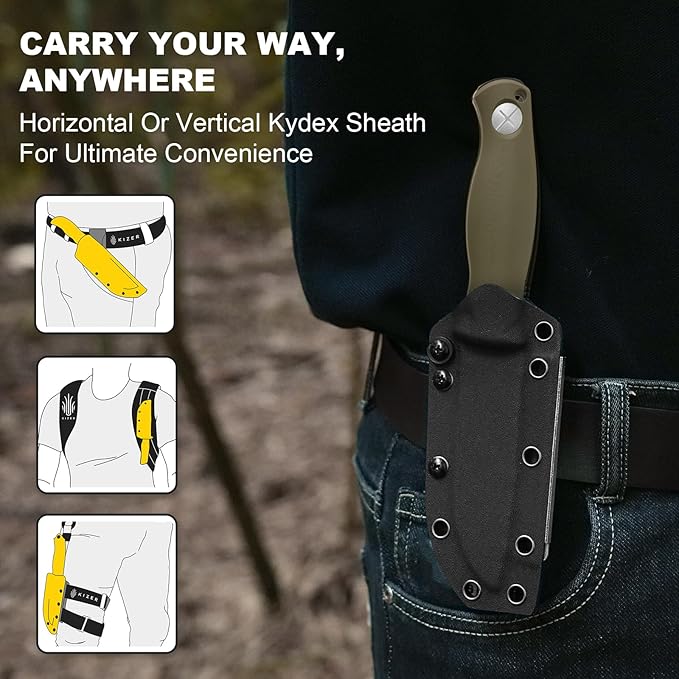 - Adjustable Kydex Sheath with Integrated Sharpener: The Kydex sheath of the horizontal carry knife offers adjustable tension and versatile mounting—horizontal or vertical—for a secure, adaptable fit in any environment; A built-in sharpener allows for quick touch-ups on the go, making it ideal for EDC, hunting, camping, and hiking