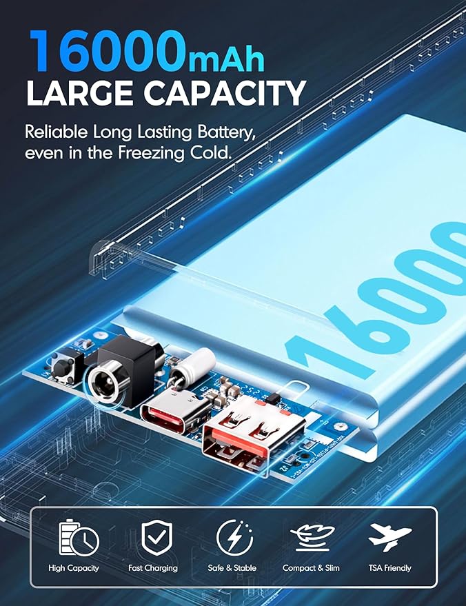 - 16000 mAh ultra-fast charging battery:This electric heating vest includes a large capacity, after safety testing 16000mAh/7.4V portable power bank with premium cells. Supporting rapid charging to save valuable time, it delivers 10h of reliable warmth even in freezing conditions.