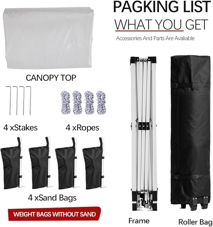 - 【All-In-One Wheeled Carry Bag】Pack once, roll anywhere. Comes with 4 sandbags, 8 stakes, and 4 ropes—everything stored neatly in a rugged wheeled bag with reinforced corners and 360° handles. Perfect for one-handed transport to campsites, fairs, or tailgate setups.