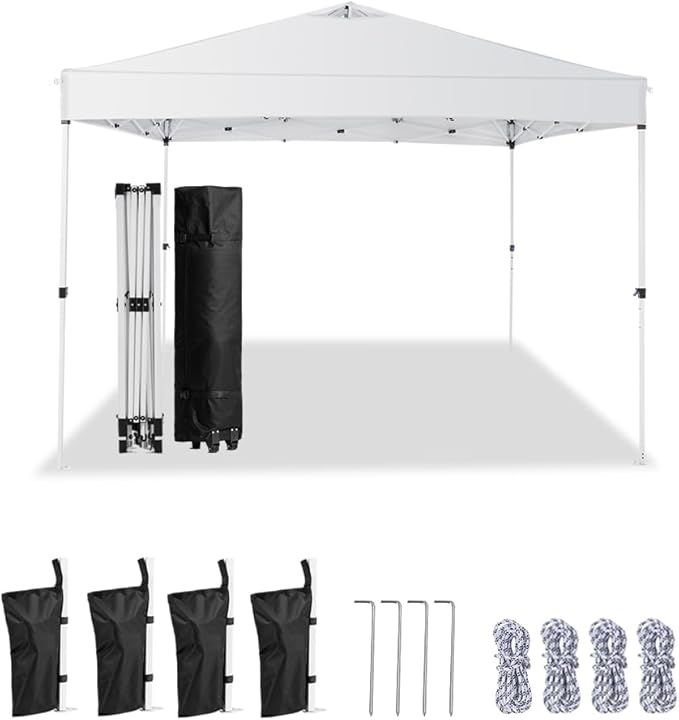 10x10 Pop Up Canopy,Event Tent – One-Person Setup, Waterproof & UV-Blocking, Heavy-Duty Steel Frame, Wheeled Bag & Sandbags – Outdoor Shade for Beach, Camping, Backyard, Tailgate (White)