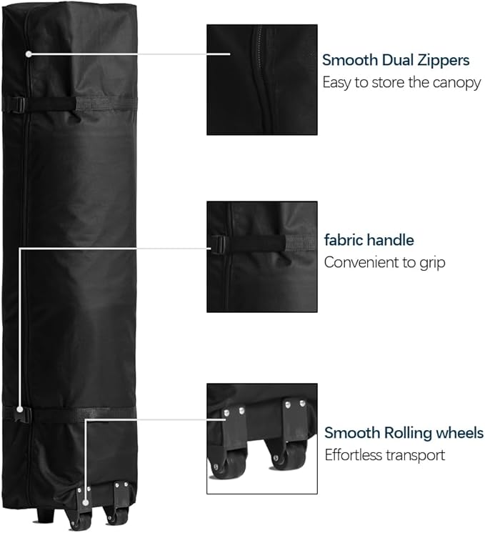 - 【All-in-One Rolling Storage Bag】 Includes 4 weight sandbags, 8 ground stakes, and 4 wind ropes. The heavy-duty wheeled bag has reinforced corners, smooth-glide wheels, and multiple carry handles. Top and side fabric handles make transport easy for one or two people. Take your portable canopy anywhere with ease.