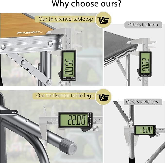 - Upgraded Thickened Design, Stable & Holds Up to 66lbs: Made of high-quality aluminum alloy, Anbte portable table features 75% thicker legs and tabletop for added stability and strength, supporting up to 66lbs. It remains stable even on sandy or uneven ground. Enjoy meals or activities without worrying about shaking