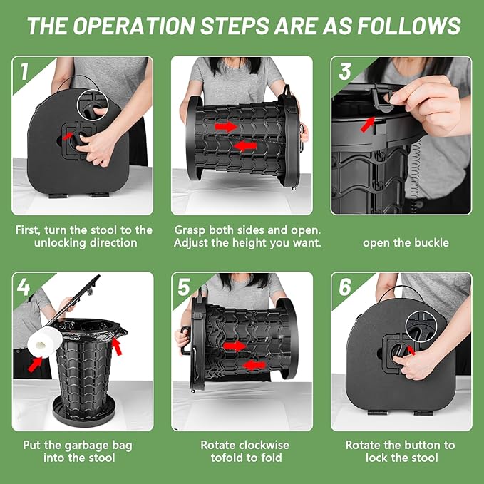 - 【Quick & Easy to Use】Pull ends and twist clockwise to start using portable potty instantly! After adjusting the height of the toilet, please confirm that the lock buckle is securely fastened before use, and be careful not to lift the toilet on one side! After use, just rotate counterclockwise and press it to a disk. (Refer to the user manual)