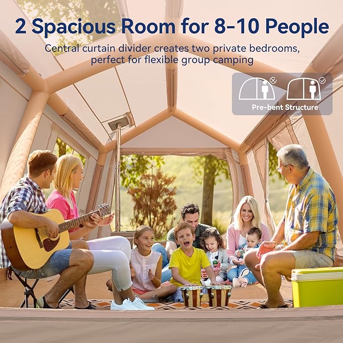 - 8-10 Person Inflatable Tent with Dual Rooms: Our inflatable tent features two divider rooms within its 157"L x 106"W interior, easily accommodating 8-10 people with their gear. Generous 79" ceiling height ensures comfortable stand-up mobility, while the pre-angled wall design optimizes living space. Ideal for families or outdoor groups wanting both shared and private areas.
