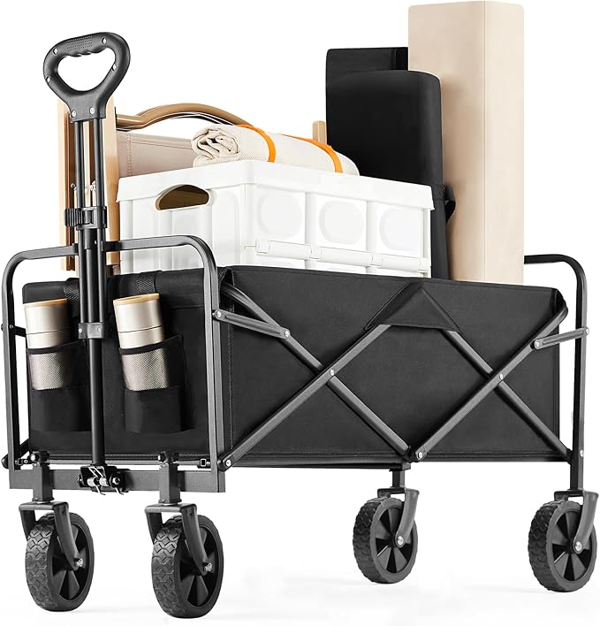 Collapsible Wagon Cart, 360lbs Heavy Duty Foldable Wagon with All-Terrain Wheels and Drink Holders for Beach Camping Shopping Garden, Black