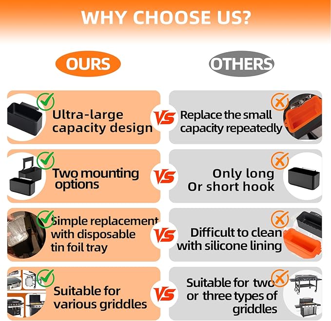 - 【Compatible Models & Two Hook Options】: Our grease traps come with long and narrow hooks for on-demand installation flexibility and are compatible with 17“, 22”, 28“ and 36” Blackstone grills; Smooth surface coating makes cleaning easier. A MUST-HAVE Grill Accessories for your Blackstone griddle !