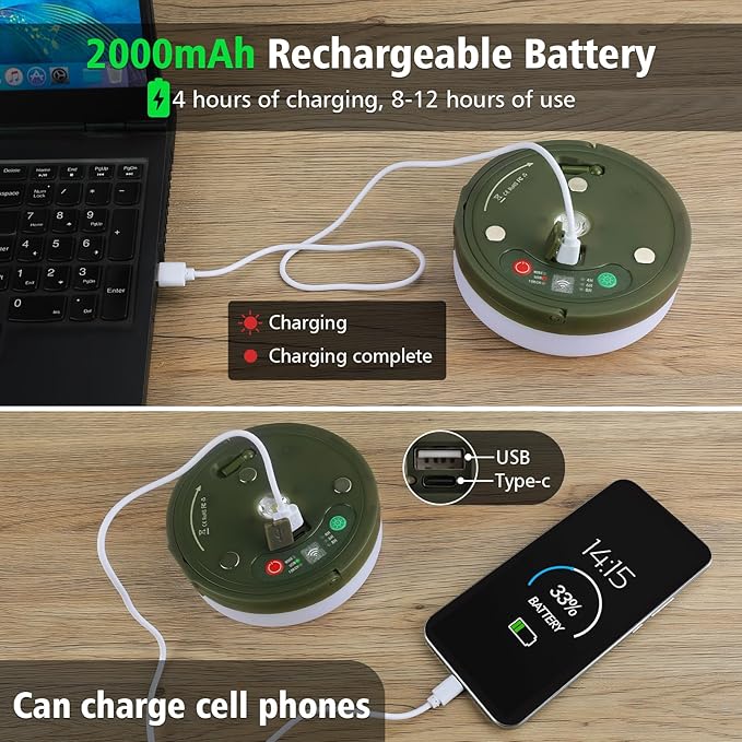 - USB Charging and Battery Indicator: The camping light features a built-in 2000mAh rechargeable battery that charges fully in just 4 hours via USB. When fully charged, it provides 5 to 12 hours of continuous operation depending on the selected lighting mode. The clear red power indicator light flashes during charging to show charging status, and remains steady when fully charged for convenient power management.