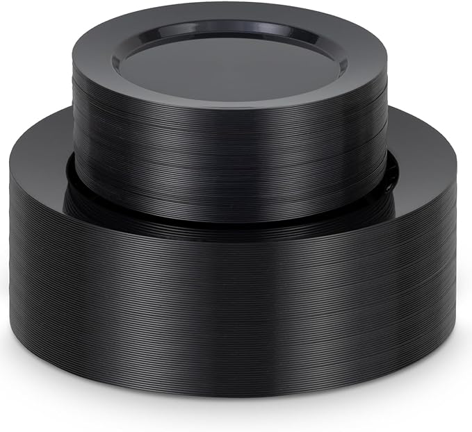 - DIMENSION DECODED - Party plate sizes for every occasion. This black plates set includes 50 dinner plates (10.25''), perfectly tailored for generous main courses and diverse meal elements. Complementing these, you'll find 50 smaller dessert plates (7.5''), ideal for presenting delectable desserts, cakes, and appetizers.