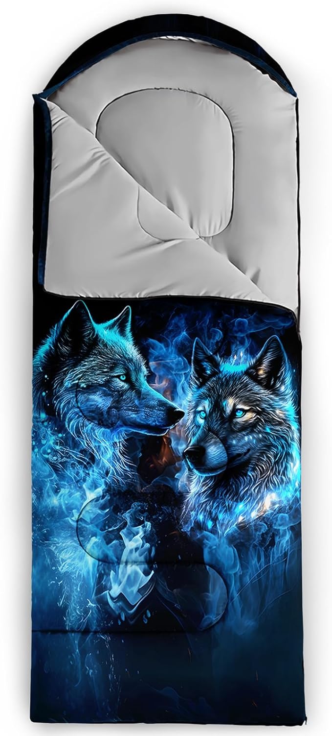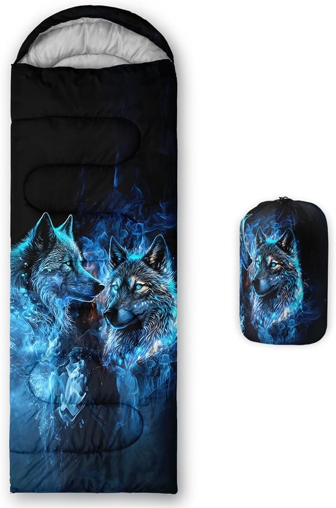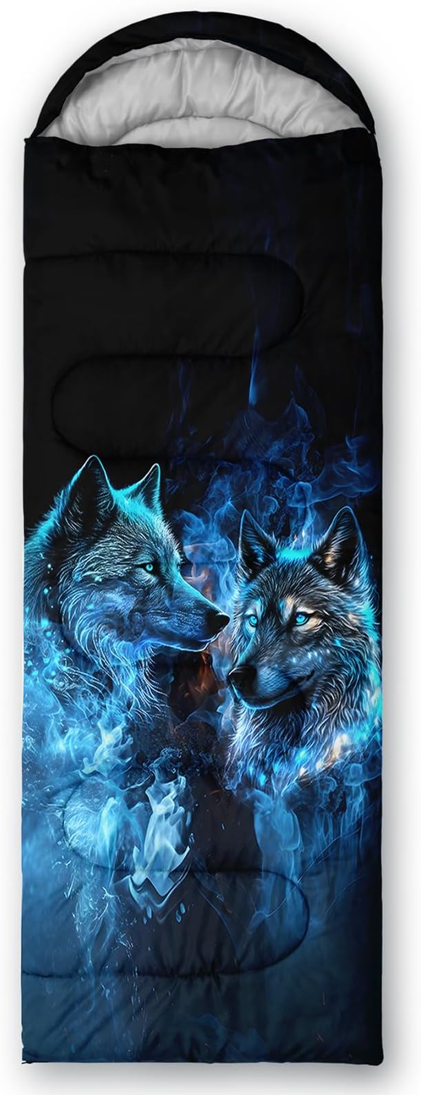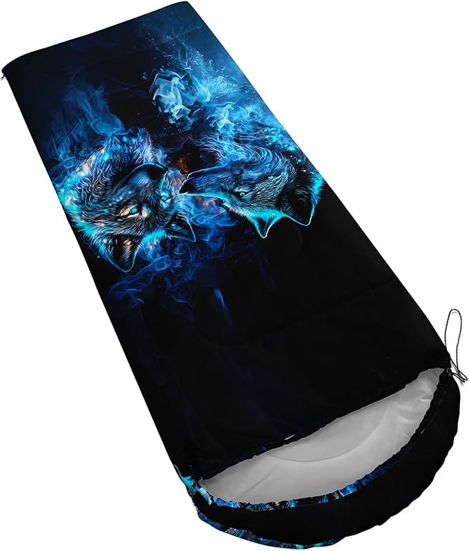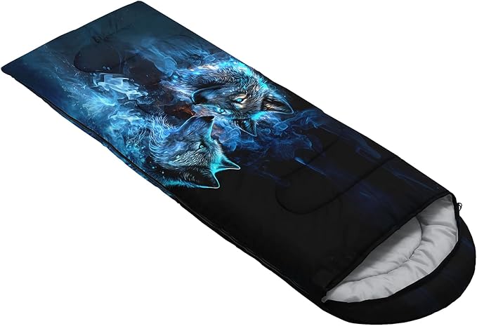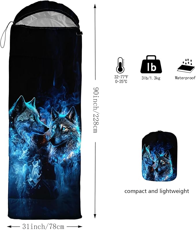 - Unique Wolf Design:This Wolf pattern sleeping bag is made of 3D digital printing with vibrant colors and patterns,size: 31W x 90L inches,temperature range: 32℉-77℉ (0℃-25℃),it also also have a weather resistant waterproof design to keep you warm and prevent you from any dampness,can be used in 3 seasons