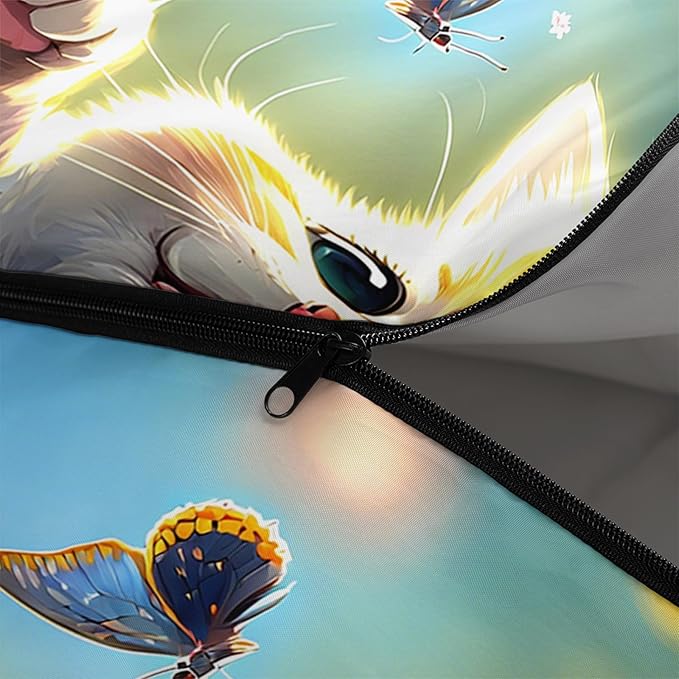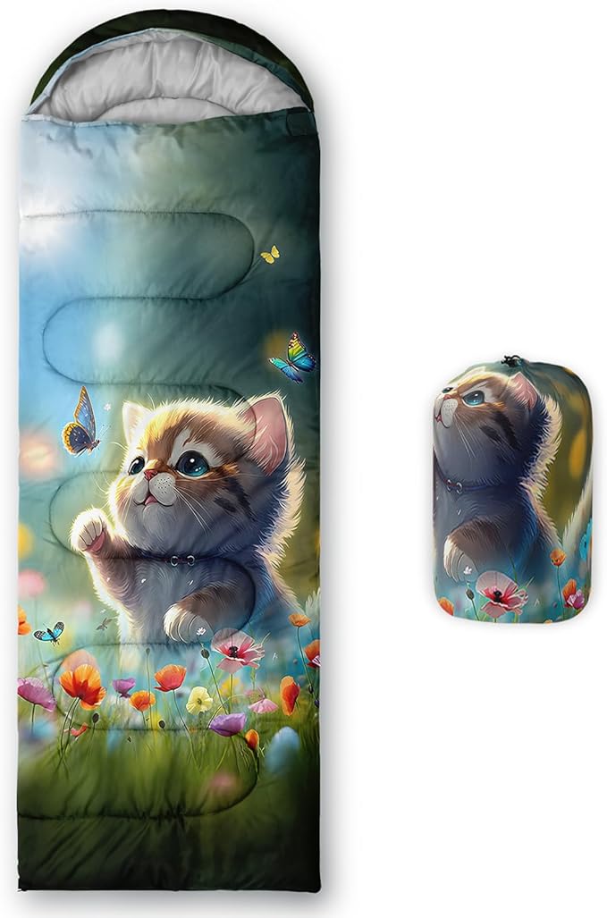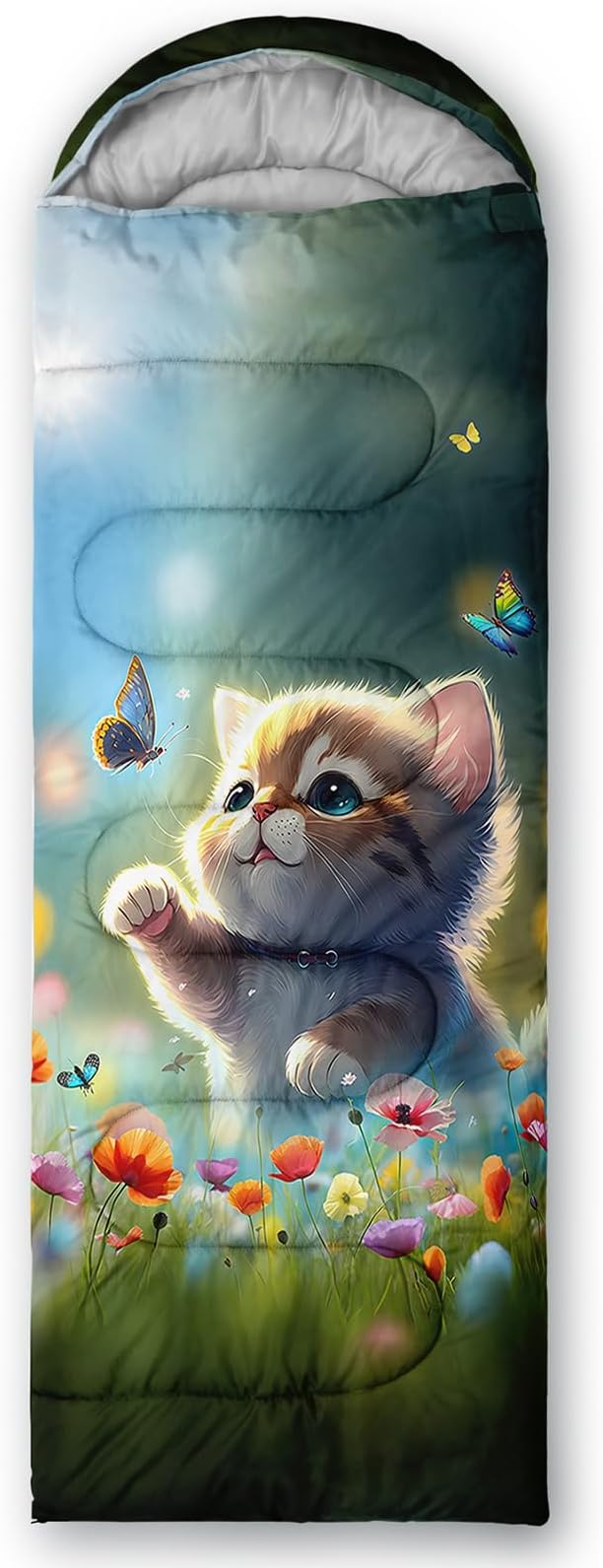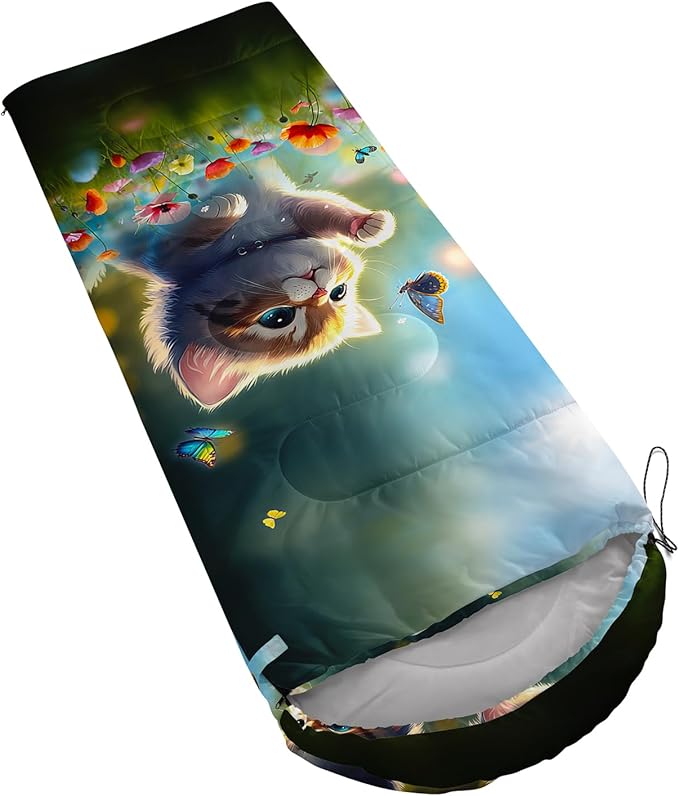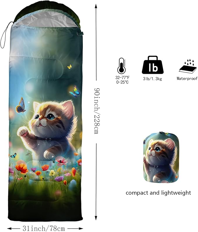 - Unique Cat Design:This Cat pattern sleeping bag is made of 3D digital printing with vibrant colors and patterns,size: 31W x 90L inches,temperature range: 32℉-77℉ (0℃-25℃),it also also have a weather resistant waterproof design to keep you warm and prevent you from any dampness,can be used in 3 seasons