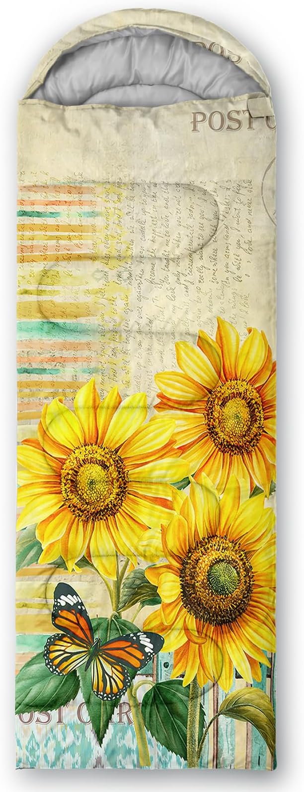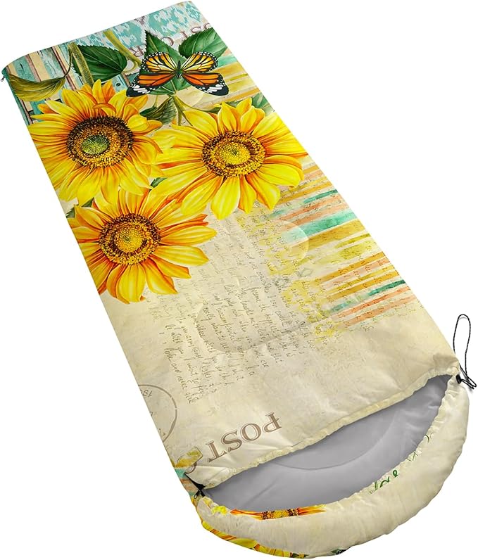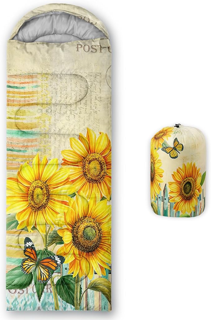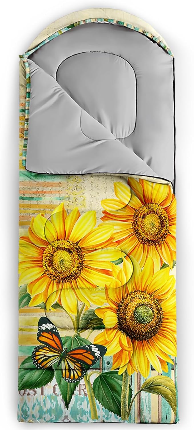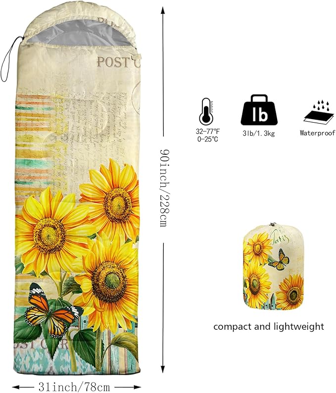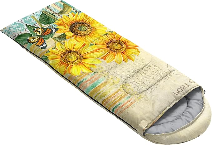 - Unique Sunflower Design:This Sunflower pattern sleeping bag is made of 3D digital printing with vibrant colors and patterns,size: 31W x 90L inches,temperature range: 32℉-77℉ (0℃-25℃),it also also have a weather resistant waterproof design to keep you warm and prevent you from any dampness,can be used in 3 seasons
