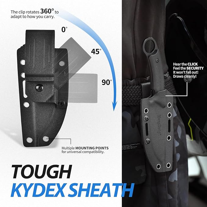 - 1. Adjustment Kydex Sheath: Safe high- strength lightweight, high temperature resistance and corrosion resistant imported Kydex material sheath for easy adjustment and everyday carry. The sheath is tight, without rattle, but still allows quick deployment. It holds the knife well and has good retention.