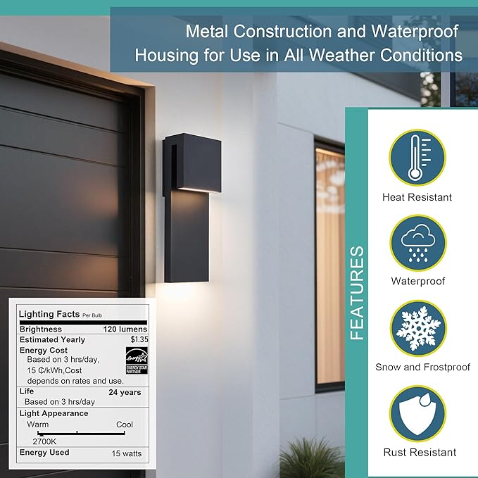 - 【Anti-rust and Waterproof】: Fully sealed metal structure, equipped with durable electrophoresis and Textured Black finish double layer protection, so that the whole luminaire body with IP65 rating, and waterproof, sun, snow, dust, wind. It can be easily installed in a variety of complex climatic environments. Each outdoor wall light has undergone meticulous testing to ensure unparalleled durability and longevity, even in the harshest outdoor environments.