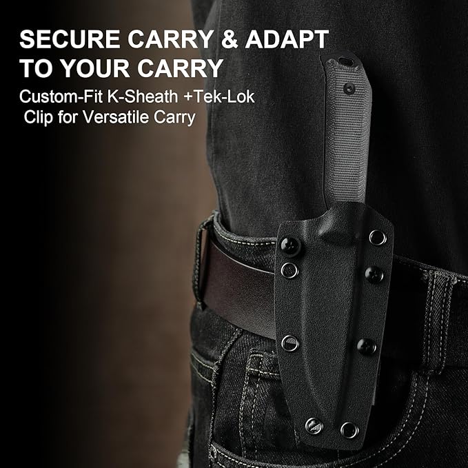 - Secure Carry & Adapt to Your Carry: The Begleiter Fix features a custom-fit Kydex sheath, engineered with precision molding for a secure, rattle-free hold. This fixed blade knife with Kydex sheath includes a Tek-Lok style clip for vertical or horizontal carry, making it easy to tailor your setup to your needs. Its adaptable design makes it a top choice among camping fixed blade knives, keeping your knife firmly in place during any outdoor activity.