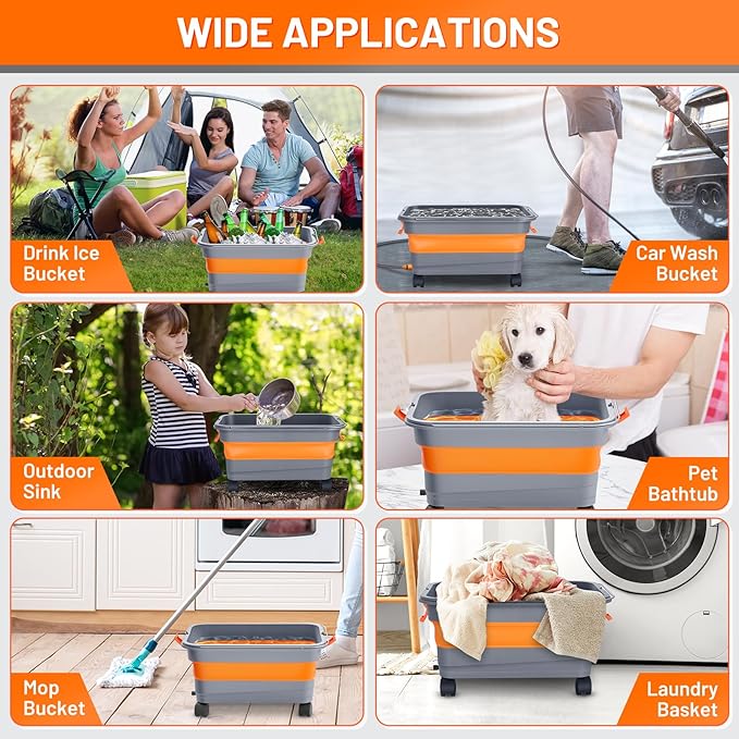 - 🎈【With 4 Wheels And Extended Handle】Equipped with 4 universal wheels and an elongated handle for easy mobility, this bucket is ideal for deep cleaning your entire house. Can be used as a mobile laundry basket and can be easily moved even when full. Ideal for use as a beverage bucket, outdoor sink or wash basin in a camping or RV, can also be used as a bathtub for small to medium sized pets.