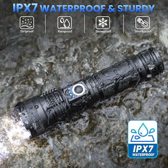 - Waterproof Design + Multiple Functions -- The handheld flashlight is made of advanced aluminum alloy, achieving IPX7 waterproof rating, and the sealed design is more waterproof. 1. The charging port is protected by a waterproof rubber cover. 2. The head adopts a tooth mark design, which can be used as a safety hammer. 3. Equipped with a portable hanging rope. 4. Intelligent system for rapid cooling