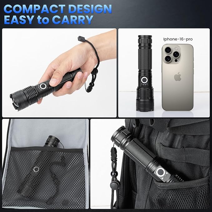 - 99,000 Lumens Ultra Bright Flashlight -- The rechargeable flashlight is equipped with the latest chip, with a maximum output of 99,000 lumens and a brightness 20 times that of a regular flashlight. The LED flashlight can illuminate objects up to 3280 feet away. It has a super long Βattery life of 15 hours in low light mode. This flashlight will be your steadfast companion, illuminating the path and conquering darkness