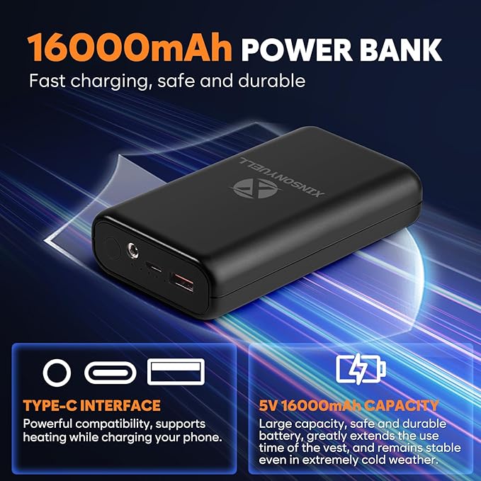 - Long Lasting Warmth: Powered by a robust 7.4V 16000mAh battery pack, this womens heated vest outlasts the competition—providing up to 12 hours of heat. Even better, it doubles as a high-capacity power bank to keep your phone or GPS charged during long adventures. No more choosing between warmth and staying connected