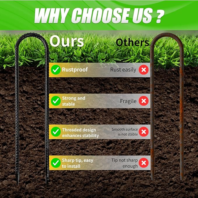 - Durable and Rustproof: The steel ground stakes are coated with an anti-rust coating that prevents rusting in humid environments and withstands various harsh weather conditions. The metal stakes for ground are made of low-alloy high-strength steel, which provides excellent stability and durability while preventing bending or breaking