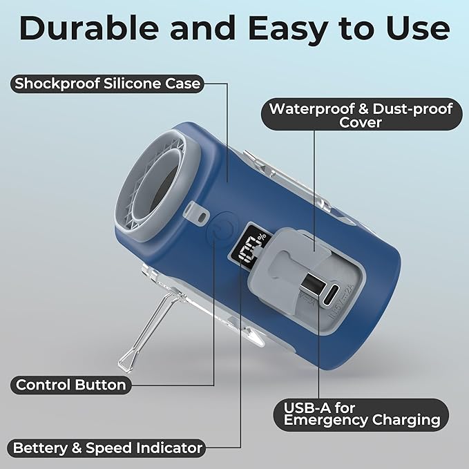 - 【24hrs Long-Lasting Battery Life】- This portable waist clip fan has a built-in 5000mAh rechargeable battery, providing a whole day comfort in the heat. It supports USB-C fast charging (fully charged in 3 hours), has a USB-A output port for emergency power, a battery indicator, and can be used while charging, perfect for outdoor activities: yard work, lawn care,warehouse, garage work, gardening, farming, doing chores, fishing, hiking, trunk driving