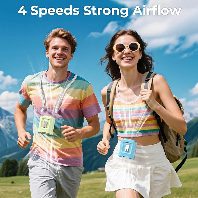 - 【Lightweight and Low Noise】- Weighing only 0.5 lbs and palm-sized (3.27 × 2.48 × 3.74 in), this mini body fan is easy to clip onto your belt and shirt. Operating at impressively low noise levels——just 35dB at speed1 and 50dB at speed4, so you can use indoor such as kitchen, gym, office, without causing any annoying disruption. With a simple one-button control, it's hassle-free to use for travel, camping trip, walk, jogging, running errands