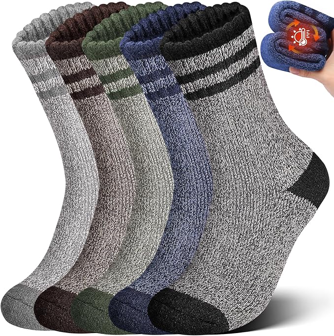 - Premium Materials: Our 5 pairs mens socks are crafted from a high quality blend of merino wool, cotton, polyester, and spandex. This exceptional combination give the wool socks mens softness and comfort, making these winter socks a must-have addition to your wardrobe. Elevate your sock collection with our thoughtfully designed wool socks that prioritize both style and functionality!