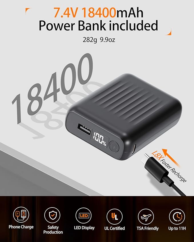 - 【18400mAh Power Bank Included – Up to 11 Hours of Safe Warmth】: Our men's heated vest is powered by a 18400mAh 7.4V large-capacity battery. One full charge provides up to 11 hours of continuous heat, providing you with long-lasting warmth. Built-in protection against overcurrent and overheating ensures safe, worry-free use. Whether you're commuting, traveling, or braving the outdoors, this heated vest for men delivers long-lasting warmth exactly when you need it