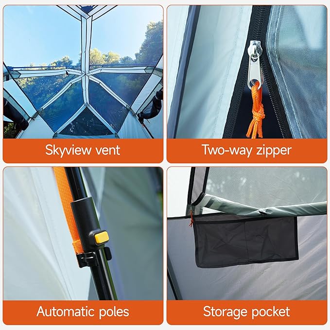 - Equipped with 19MM automatic steel tube poles, the pre-installed structure can be quickly locked without complicated assembly, and setup can be completed in 2 minute. It also comes with 2 pieces of 16MM×190CM door poles to further enhance the tent’s stability and ease of setup, allowing even camping beginners to operate independently.