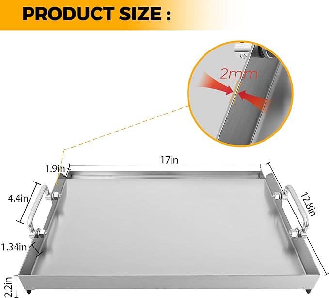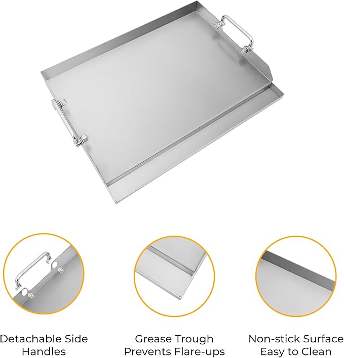 - Durable Material: The flat top griddle is made of food-grade stainless steel, which is durable, heat-resistant, rust proof, non stick, and easy to clean