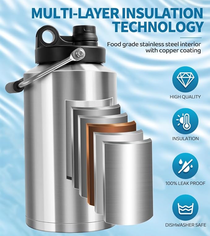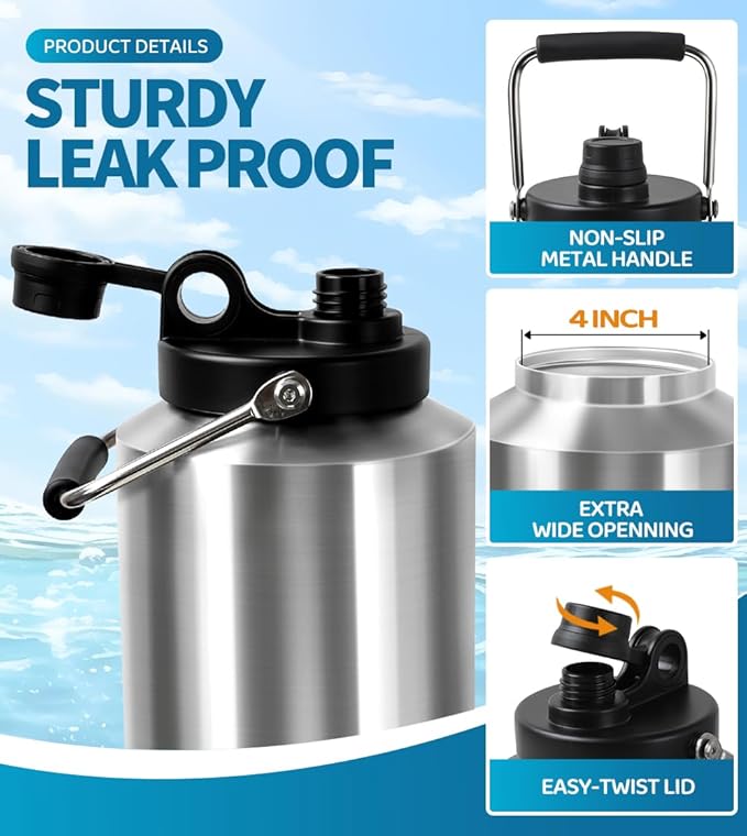 - Adventure Ready Design: The gallon-sized stainless steel insulated water jug is built for hiking, camping, or road trips. The sturdy stainless steel jug has an easy grip handle that won't slip, even when you're on the move.
