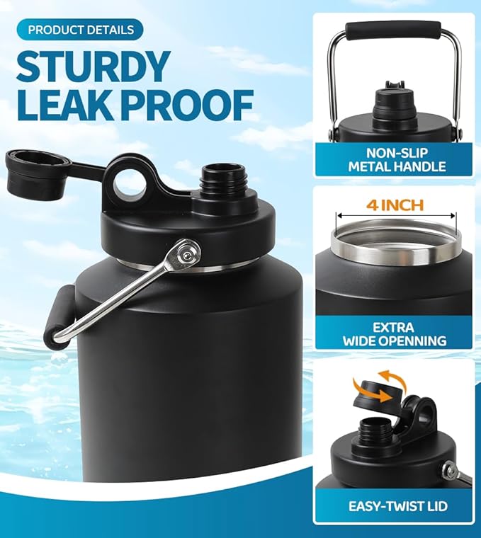 - Adventure Ready Design: The gallon-sized stainless steel insulated water jug is built for hiking, camping, or road trips. The sturdy stainless steel jug has an easy grip handle that won't slip, even when you're on the move.