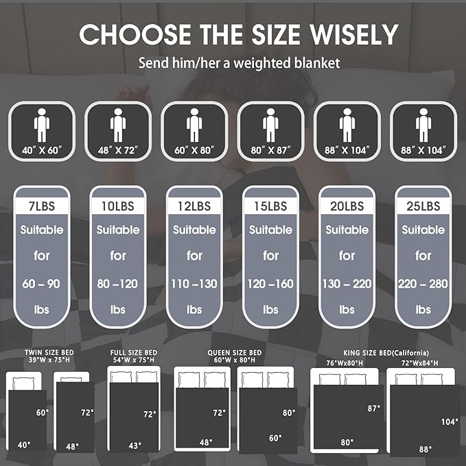 - SHOPPING GUIDE: Heavy blankets are available in 40"x60"throw size for kids,48" x72"twin size, 60"x80"queen size, 80"x87"king size, 104"x88"california king size, with 12lbs, 15lbs, 20lbs&25lbs weighted blankets respectively. You can choose freely according to your own needs, give you a variety of options.