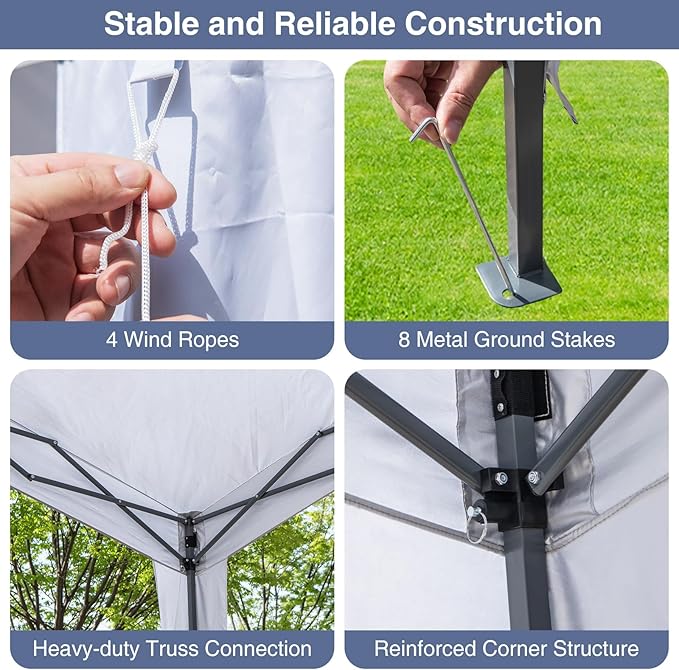 - Stable and Reliable Construction: The shelter includes 4 wind ropes and 8 metal ground stakes to anchor it firmly in place, ensuring stability and safety. The heavy-duty truss connections combined with reinforced corner structures, minimizing deformation or breakage, built to last.
