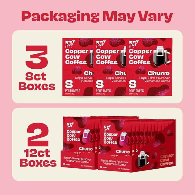 Copper Cow Premium Pour Over Single-Serve Vietnamese Coffee | Churro | Dark Roast | Flavored with Real Cinnamon | Includes 24 Coffees