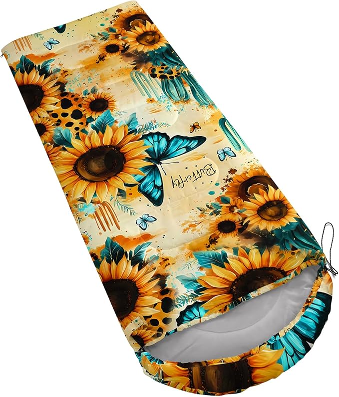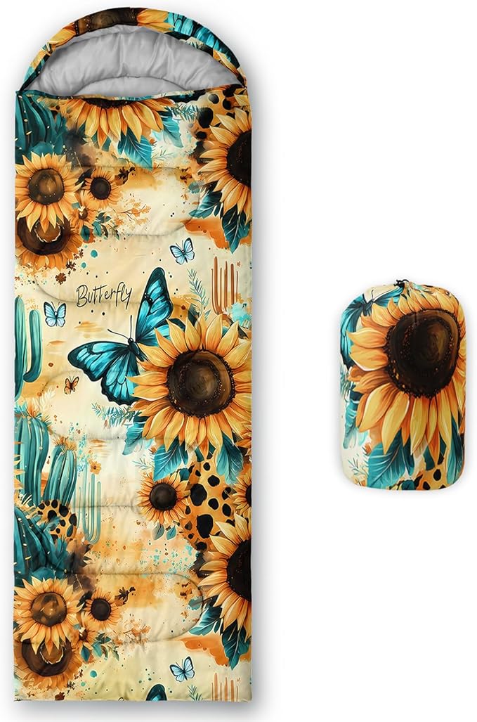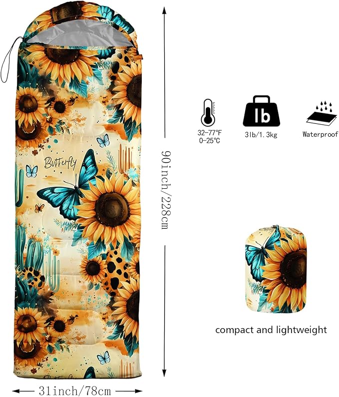 - 【Fits For 3 Seasons】: Size - 31 by 90 inches (W x D). Our sunflowers sleeping bag can be used in 3 seasons with a design temperature of 32℉-77℉(0℃-25℃). These Sleeping bags also have a weather resistant waterproof design to keep you warm and prevent you from any dampness.