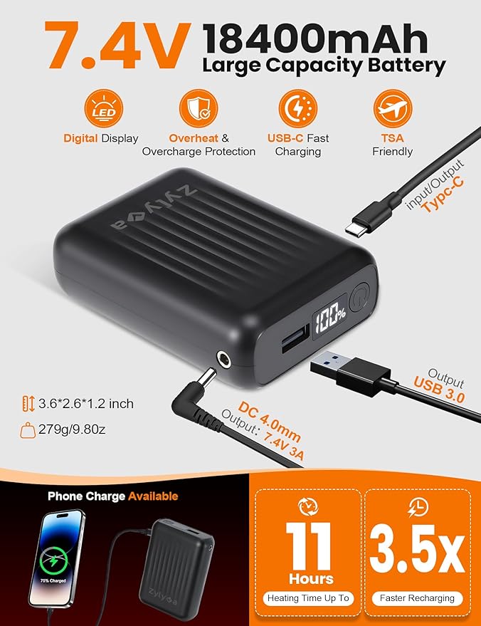 - 18400mAh BATTERY PACK INCLUDED – QUICK CHARGE & LONG-LASTING WARMTH:Our heated vest with battery pack included comes with a 7.4V 18400mAh UL/CE-certified power bank that delivers up to 11 hours of continuous warmth. It not only powers the heated vest but also fast-charges your phone or other devices via the 5A Type-C port. Ideal for travel, daily commutes, or extreme winter use, this heated vest is built for performance and comfort. The ultimate battery heated vest can rely on in cold weather.