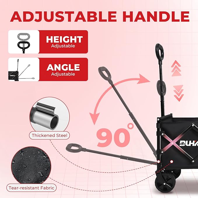 - Ergonomic Telescopic Handle With Easy Grip:Adjustable pull handle offers a secure, comfortable grip to reduce wrist strain. Push or pull this folding utility wagon easily—even when fully loaded for groceries, beach days, or camping trips