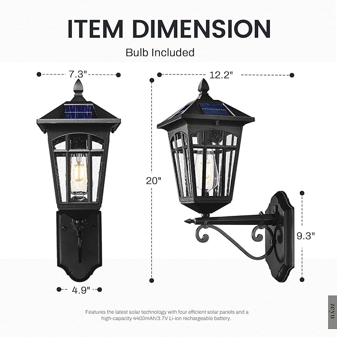 - Solar-Powered: This solar outdoor wall light features advanced solar technology with four efficient panels and a 4400mAh/3.7V Li-ion battery. Fully charges in 8-10 hours and offers up to 12 hours of night illumination.